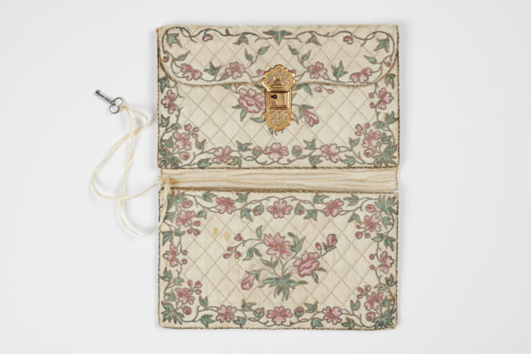 Design was significant, too, as pocket books served both functional and symbolic purposes. The detailed design and hand needlework would have communicated an owner’s status and taste. Popular themes, such as pastoral scenes, birds, or floral arrangements, aligned with broader artistic movements of the time and reflected the user’s knowledge and access to high-quality, fashionable embroidery. We can therefore gain insight into the techniques, tools, and materials used by 18th-century embroiderers, understanding what was deemed attractive and worthy of popular attention in a certain time. Equally, the physical materials used, such as lustrous silk threads and dyed satins and printed cottons, shed light on the availability of resources, as well as evolving trends in textile production.