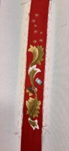 The coat of arms for this particular livery company includes an acorn, and it was decided that oak leaves would be the perfect foliage to run up the ribbon. The Greek God Apollo is the ancient patron deity of the arts, and his sacred plant was the acanthus, so we interwove some acanthus scrolls into the embroidery too.