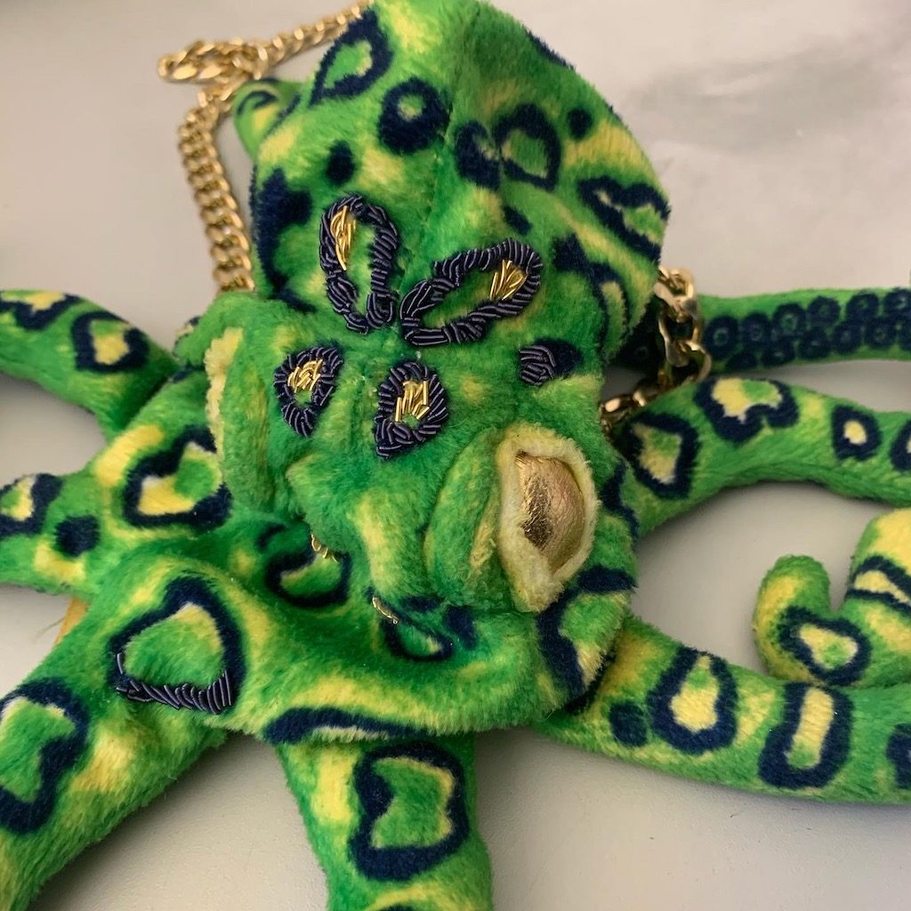- an accessory sample I’ve been working on. I’m looking at deconstructing toys found in charity shops. I’ve fully lined the octopus (which I named Dave) and have attached a second hand bag chain and sampled some Goldwork embroidery.