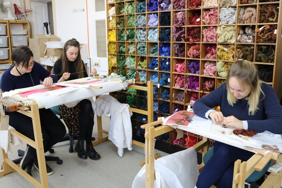 Whilst in the Studio, the FTs are assigned a Studio Embroiderer to oversee the piece they are either training on or working on, to consolidate their learning. It is important that the FTs see themselves as part of the Studio team so, wherever possible, we will include them to work on large pieces or urgently required commissions . This involvement also includes general housekeeping undertaken by all, such as the washing and learning to keep their working area tidy so that it is a safe working environment for everyone. During their time with us, we aim for them to experience a true sense of the way the Studio operates. It is important as one of the team, to be willing and able to take on different jobs and duties in order to support colleagues.