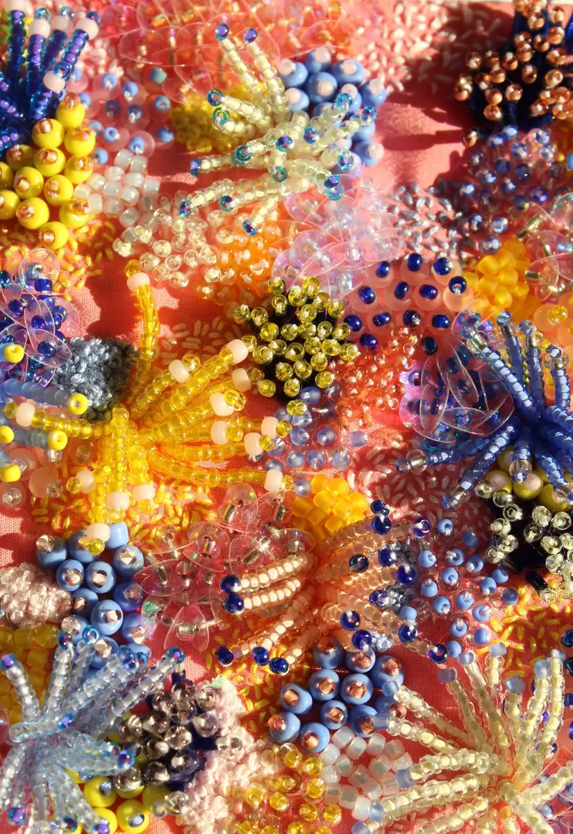 In this 2 day workshop you’ll master the art of 3D beaded embroidery, creating a coral inspired beaded box frame. On the morning of the first day of the workshop we’ll work through a mini kit, where you will learn all the 3D beading techniques you’ll need to create the coral inspired embroideries. Including; bugle bead work, sequin work, beaded fireworks and simple beaded embellishment. You’ll also be taught the signature hand embroidery stitches Imogen uses to create textures in the background of her beaded pieces. Such as french knots and seed stitch. Once the basics have be taught, you will pick the colours for your framed beaded embroidery. There will be a selection for you to choose from. If you want to bring anything from home you are more than welcome, but there will be plenty available in the workshop.