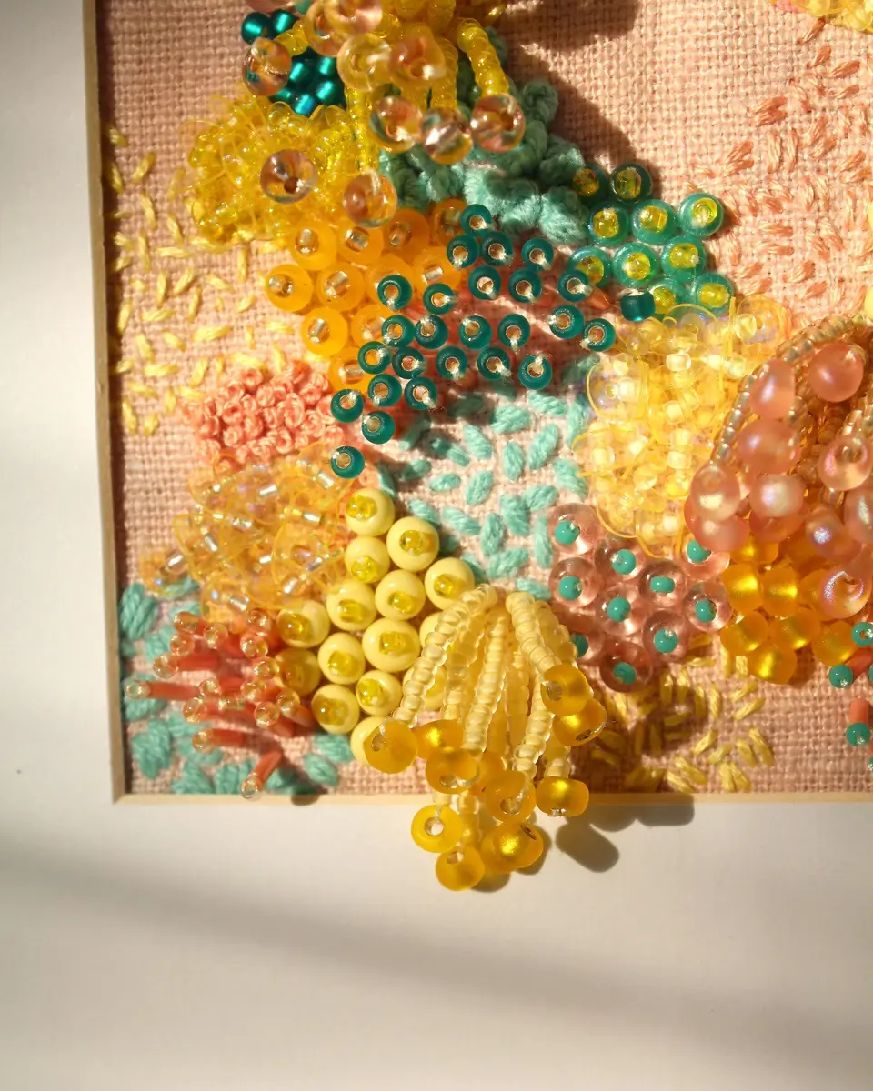 In 2020, Imogen launched Imogen Melissa with the aim of modernising perceptions of embroidery—one bead at a time. She creates intricate embroideries with playful colour combinations, reimagining them as contemporary artworks for the home. What began as selling original artworks soon grew into something new: a limited run of embroidery kits, designed so customers could enjoy beaded embroidery at home.