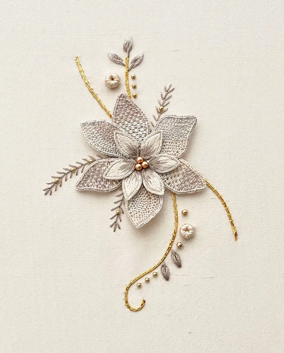The design incorporates a range of threads, including hand-dyed perlé thread and stranded cotton, and is worked on a silk dupion background fabric. These combined techniques create texture, dimension, and intricate detail, making the piece both visually striking and technically engaging.