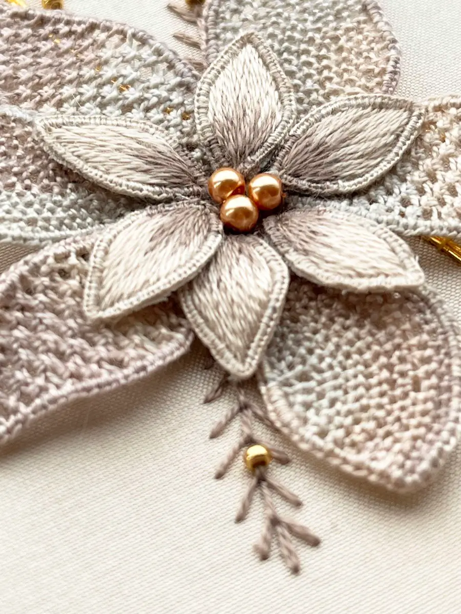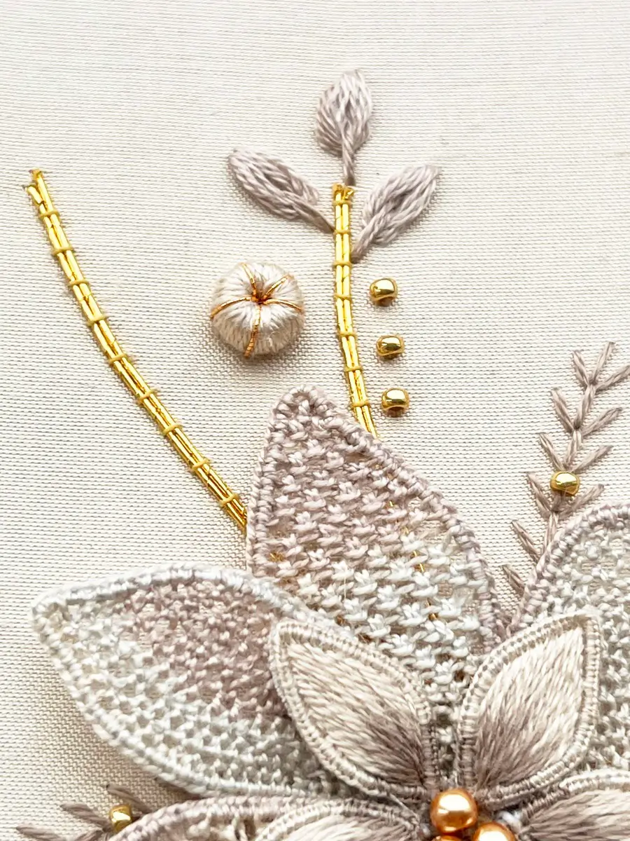 This floral design explores a variety of raised embroidery techniques, including embroidered wired shapes, wired needlelace petals, wrapped beads, raised leaf stitch, couching metal threads, and bead embellishment.