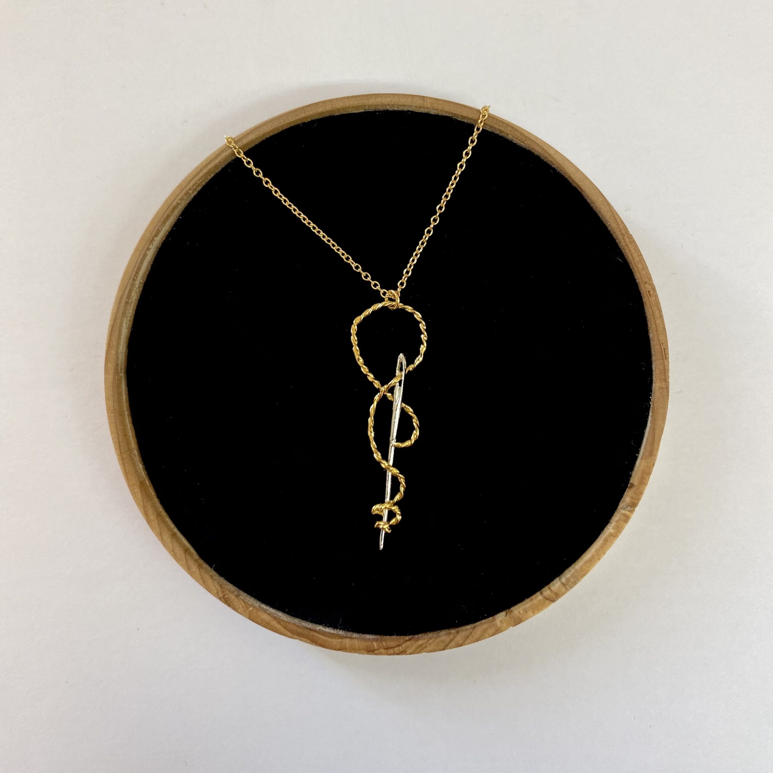 Whether you love mending things or the art of embroidery, this Twisting Thread & Needle Necklace is an ode to spending time sewing.