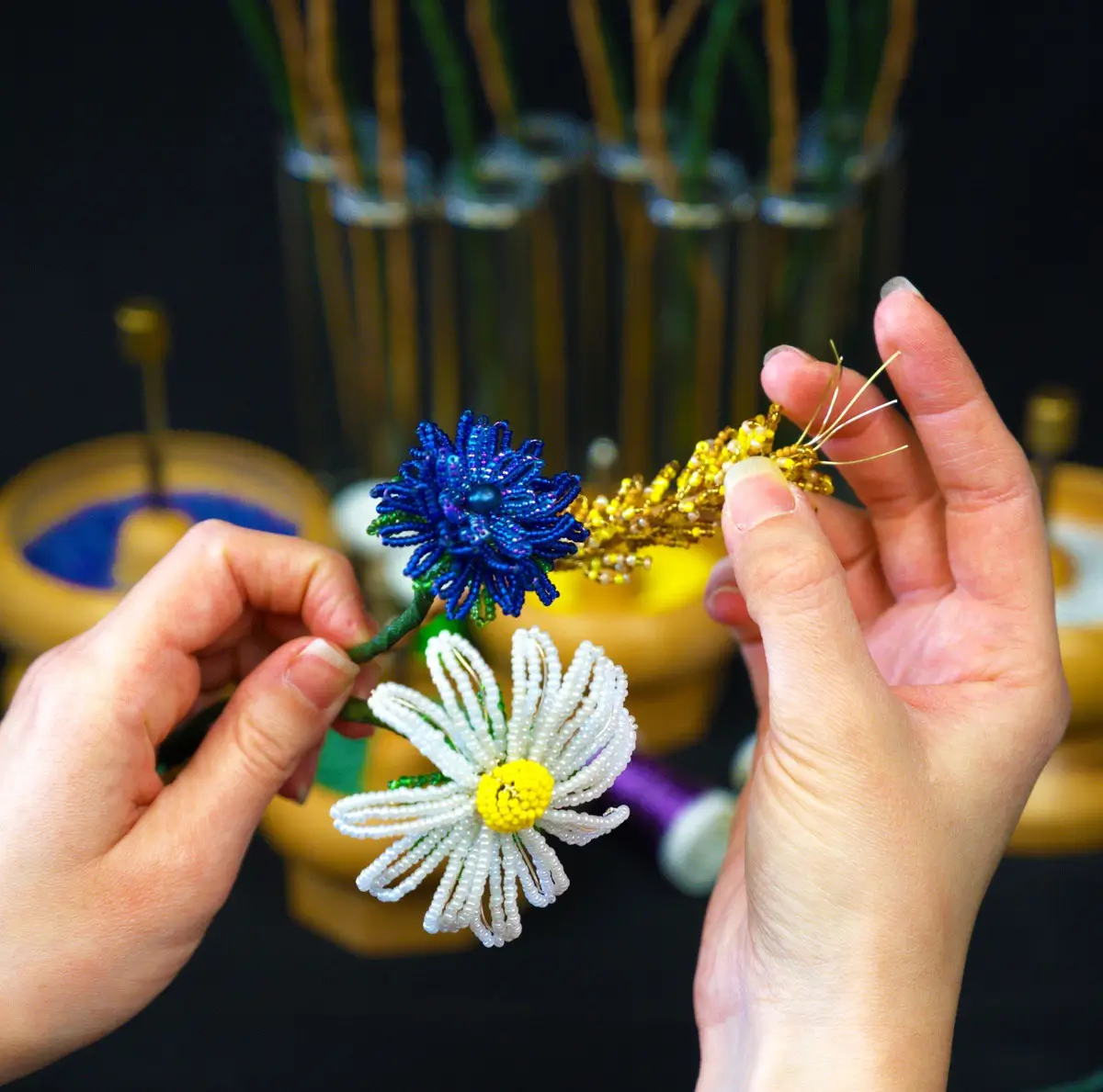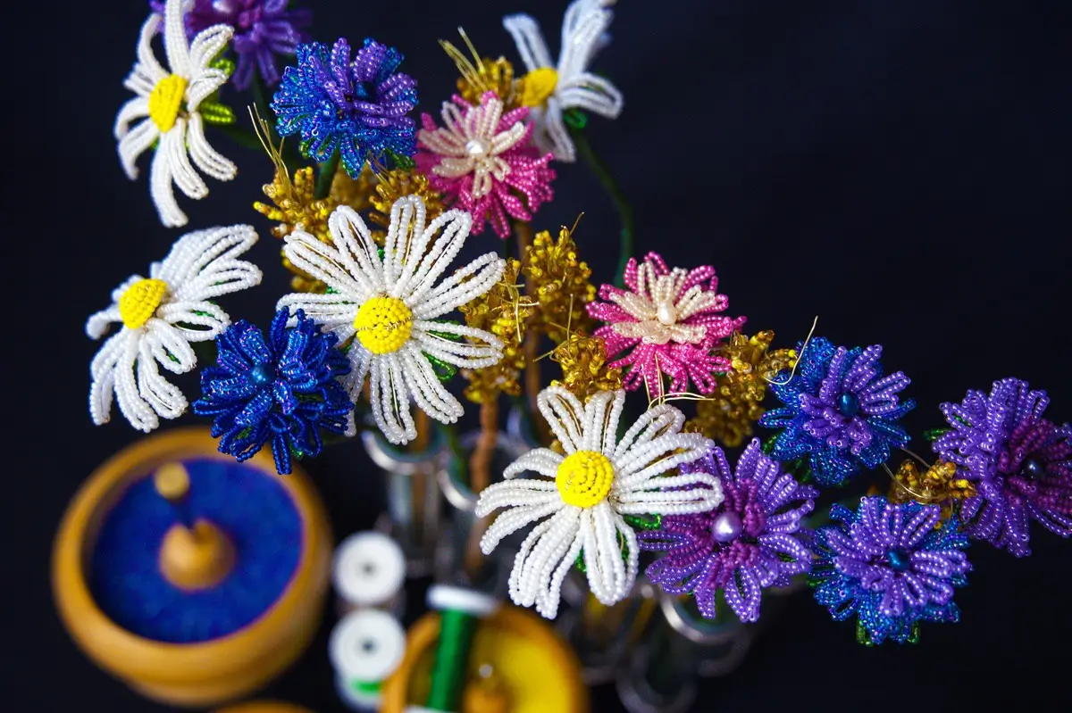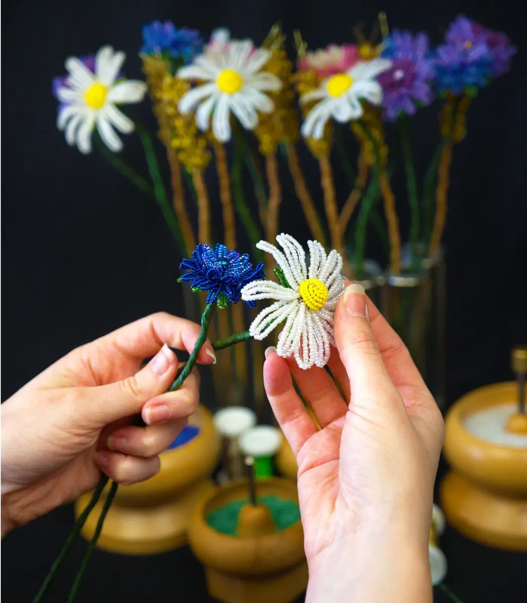 Who doesn’t love the hazy days of summer and the joy the wildflowers bring as they pop up everywhere, defying manmade structure?! Let us come together and celebrate Wonderful Wildflowers. Over our day’s exploration of the lost art of Venetian Glass Flower Art, better known as French Beading, we will experiment with wildflower designs: Cornflowers, Ox-eye Daisies and Wheat stems. Tutor, Holly Parr, will lead this lesson, offering demonstrations and careful one to one support throughout. With taught patterns being provided for your future use. This course is suitable for all levels and is the perfect opportunity to escape reality and get lost in the therapeutic process. Working with glass beads and wire you will be amazed by how ethereal your finished blooms appears. Despite being solid, sculptural creation these glass beaded flowers appear soft and delicate, transforming under differing lighting states. By the end of the course you will have completed your collection of wildflower stems that will last the test of time.