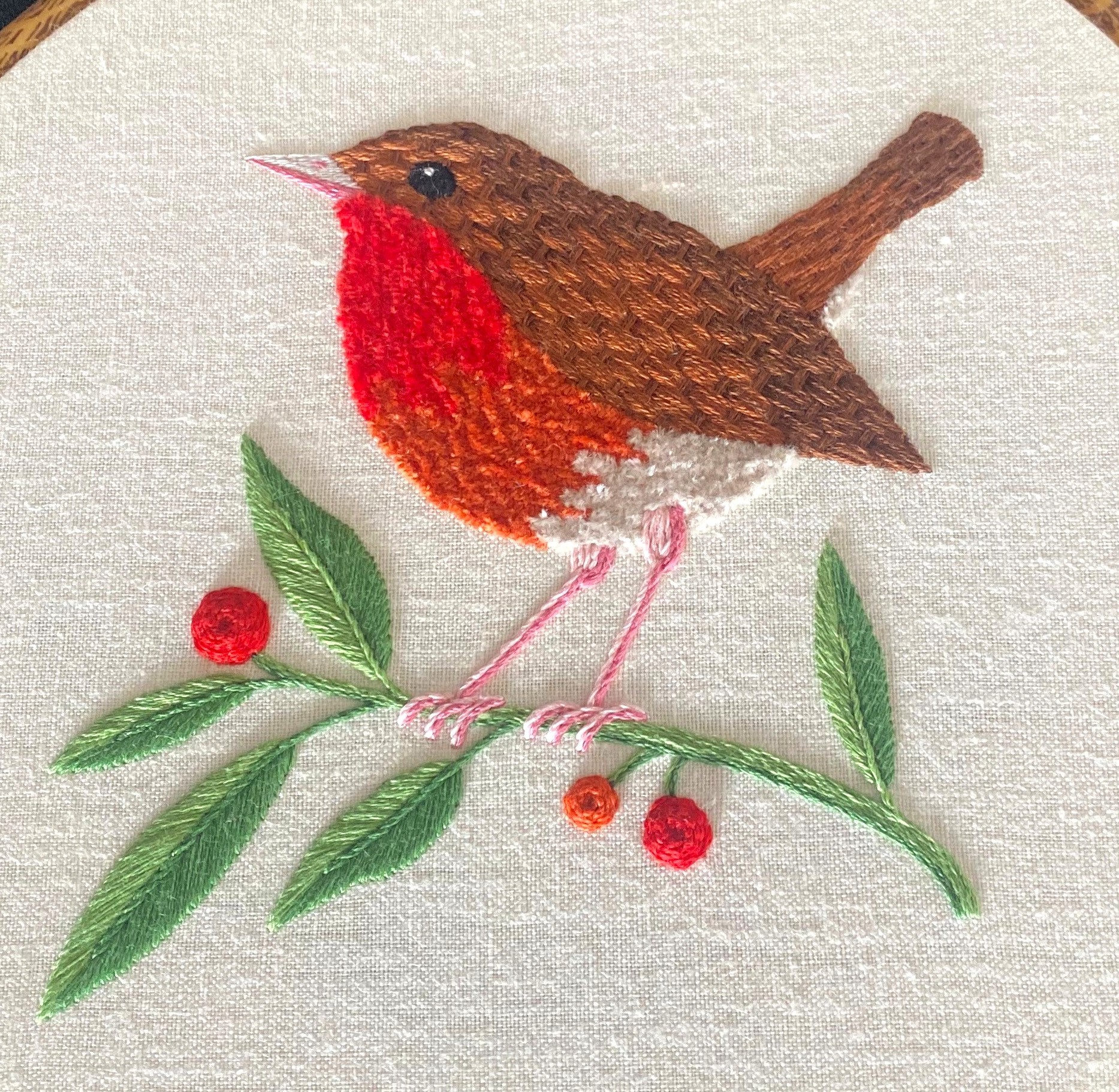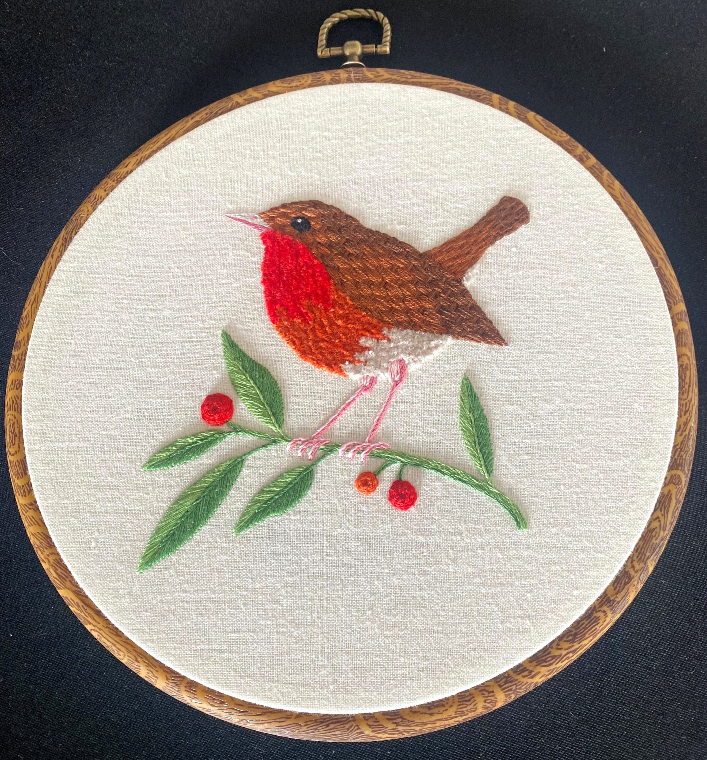 During the day Kathryn will show you how to create your robin using variations of 5 stitches: satin stitch, stem stitch, couching, burden filling and woven wheels. Not only will you be guided through each of the stitches, but you will also learn ways to incorporate some simple shading.