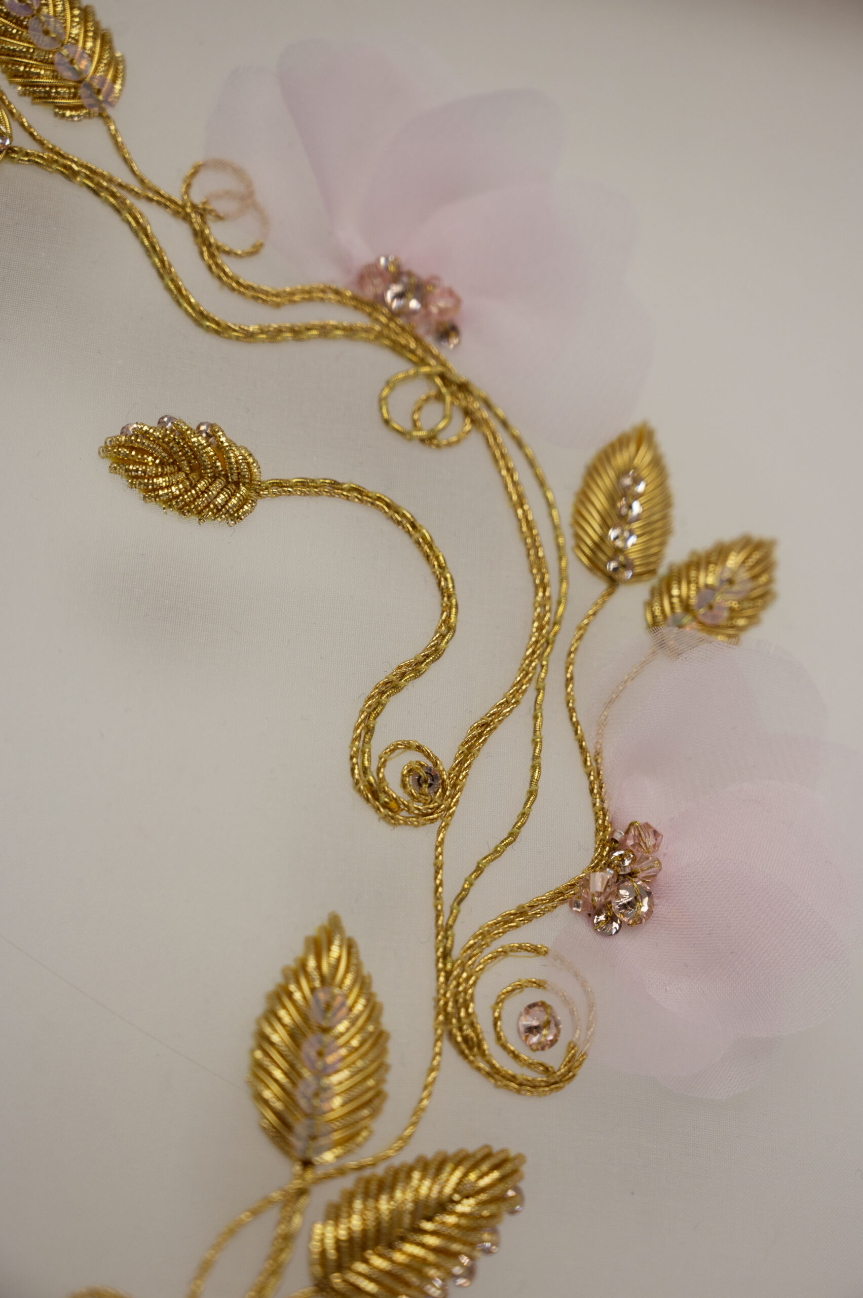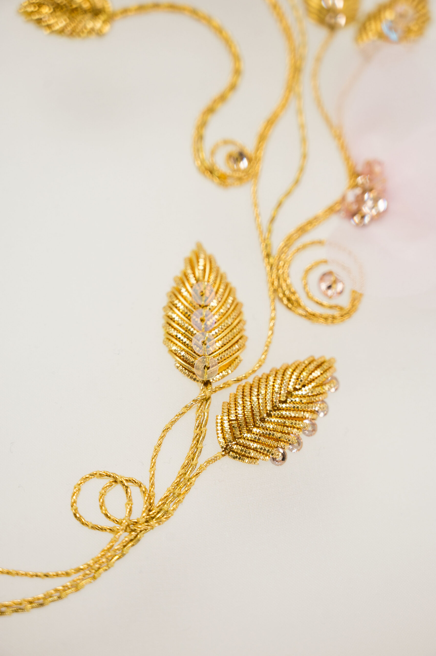 Students will learn traditional Goldwork techniques such as couching gold threads in an organic way to create fluidity, alongside cutwork to build texture and depth. The course will then explore how to combine couture-inspired elements, such as layered fabric petals and beads.