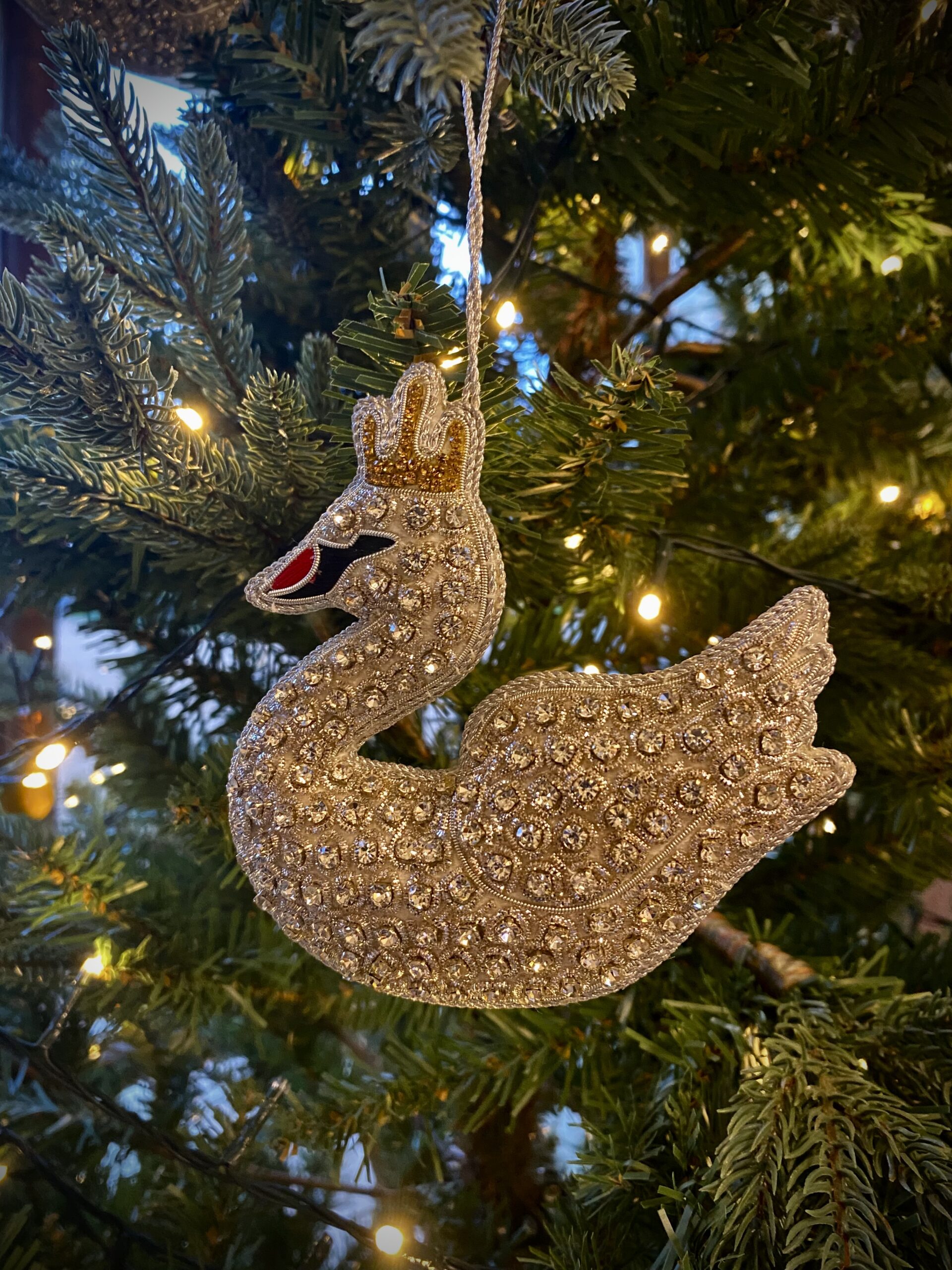 Full of regality, this luxury crystal encrusted swan decoration would make a unique addition to your tree. Handmade and encrusted with crystals on a plush white velvet background.