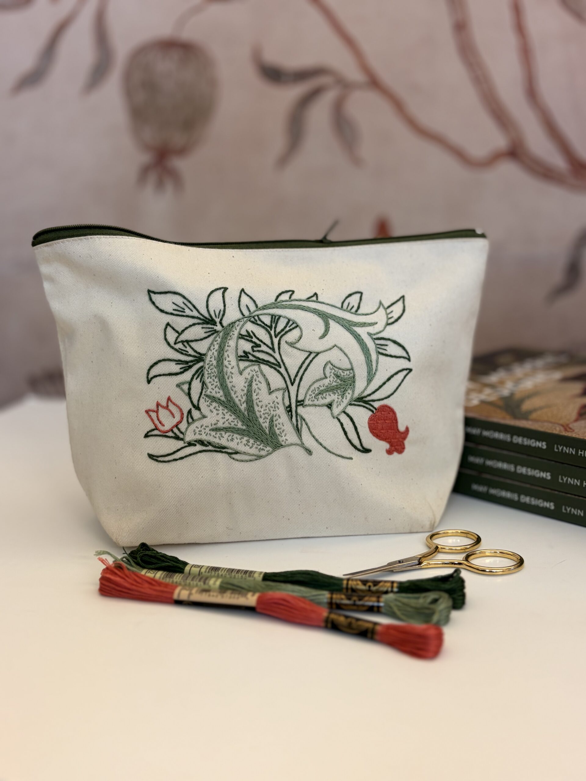 While away the hours embroidering this useful pouch, featuring a decorative design by May Morris. Learn the stitches and techniques she used and enjoy the pleasure of creating a beautiful, practical item with your own hands.