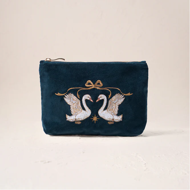 Enchantment in every thread. Featuring two graceful swans on a midnight velvet base embroidered with golden ribbons, laurels and stars, this design is the most magical home for your day-to-day essentials.