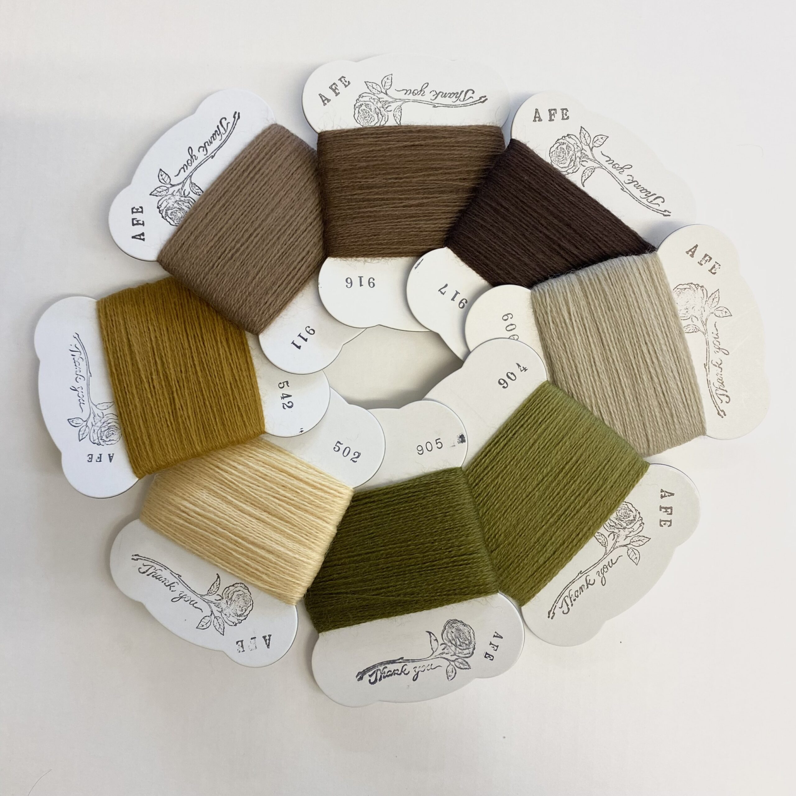 Exclusive to RSN, colour themed packs of fine crewel wool from Japanese thread company AFE. These beautiful collections of crewel wool have been expertly curated by Masako Newton, exclusively for the RSN Shop. Fine Australian merino wool which is dyed by AFE to their exacting colour standards, each pack contains 8 different shades of 50 meters on card bobbins in the following colour themes – Rose, Thistle, Duck Egg, Pansy, Forest and Sky.