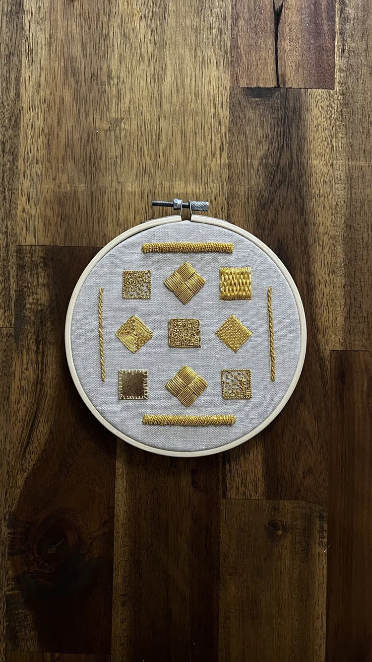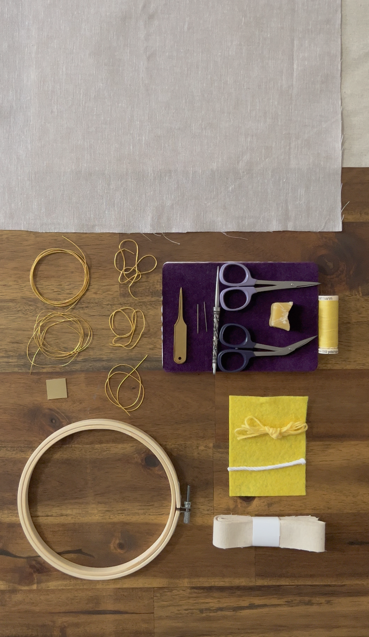 An introduction to goldwork embroidery including a variety of traditional goldwork materials and techniques. Perfect for any skill level, the kit teaches 16 essential goldwork teachniques. Everything you need to complete the kit is included along with a detailed digital instruction booklet and photo guide.