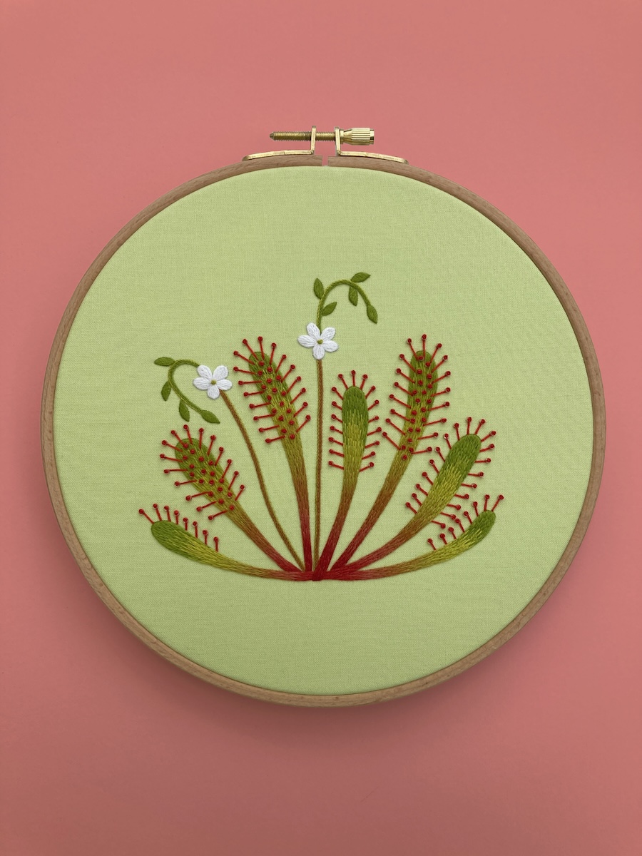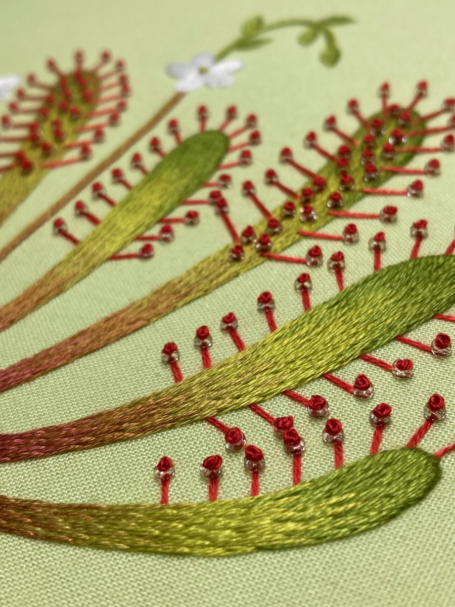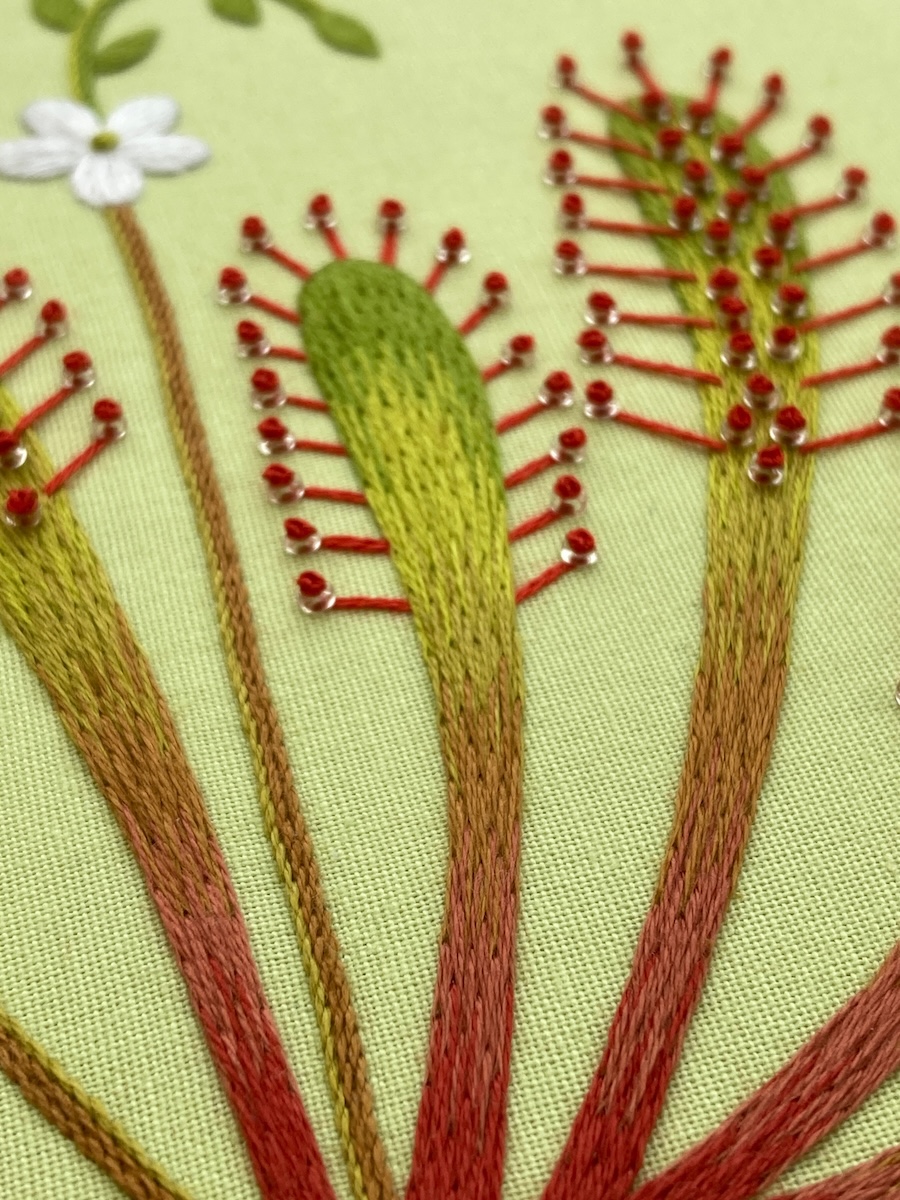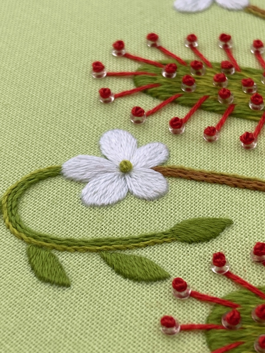 This design provides an introduction to long and short shading of the leaves from green to pink. It also covers other surface stitches, including split stitch, stem stitch, satin sticth and colonial knots. It is finished with the application of glass beads to recreate the sticky dew at the tips of the leaves’ hair-like tendrils. Using a selection of bright stranded cottons and glass beads, this design is worked on a complementary pale-green cotton fabric.