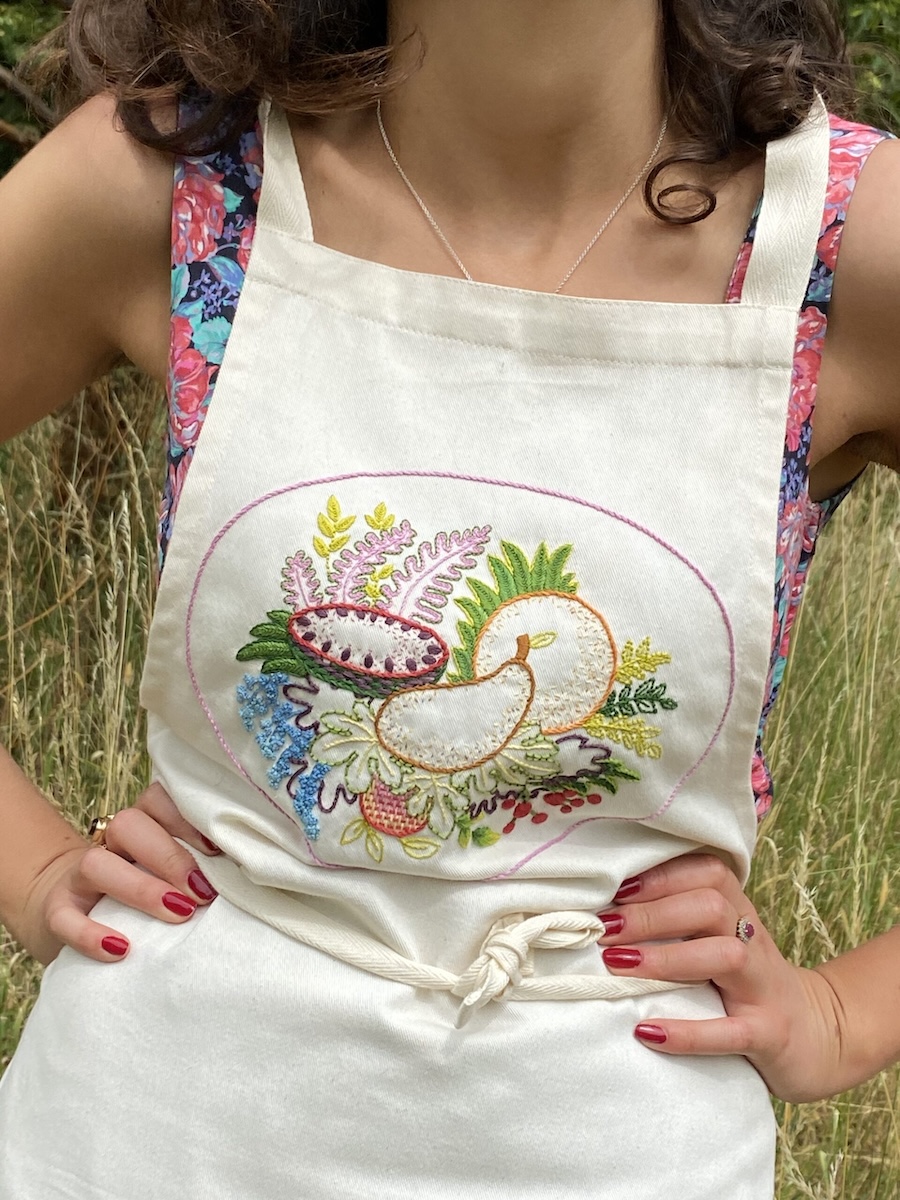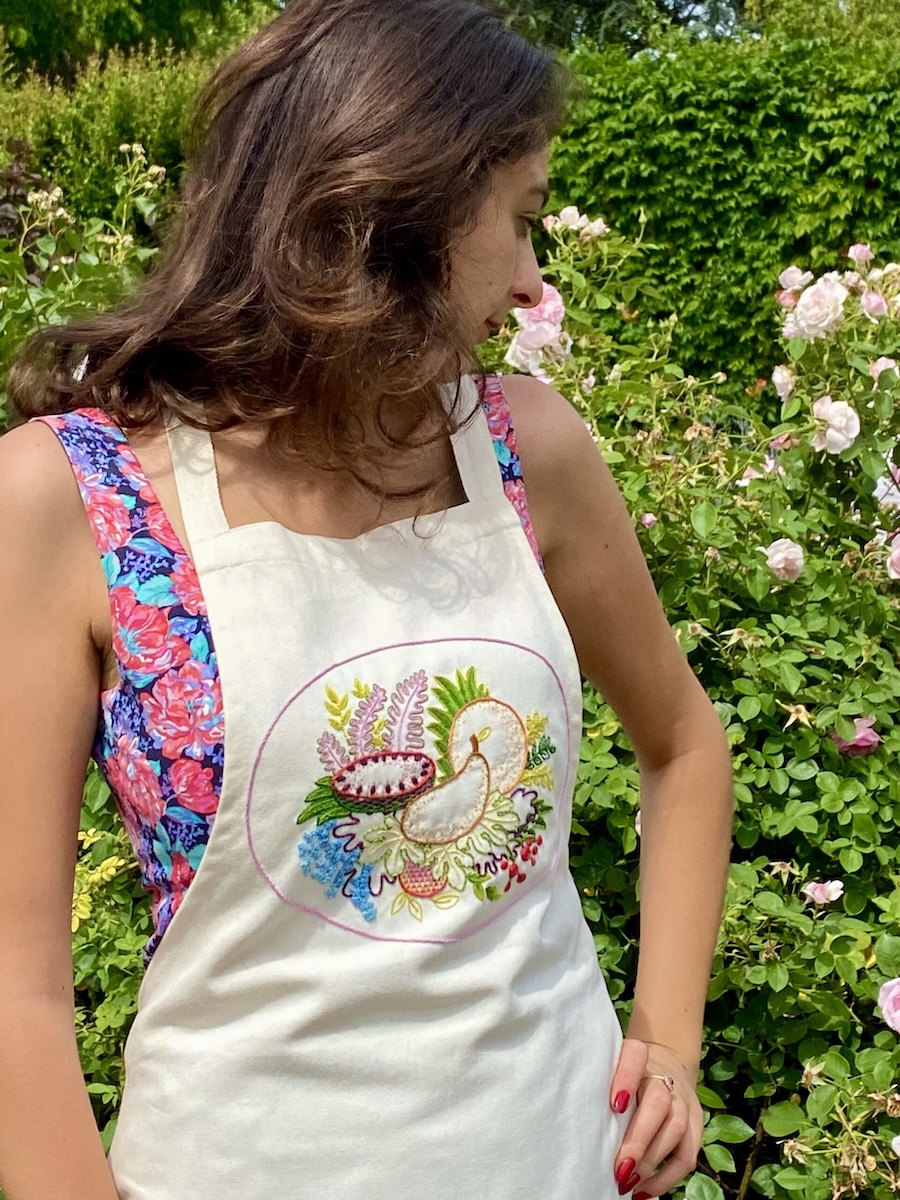 The design is printed onto the apron ready to be embroidered in a selection of colours, with the chance to add extra details to make it your own. The RSN Embroidery Studio has been at the heart of the Royal School of Needlework since it was founded in 1872. It is renowned for its exquisite hand embroidery for a range of clients including interior designers, fashion houses and private clients.
