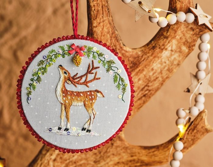Threadpainted Christmas ornament featuring an enchanting deer beneath a festive garland.