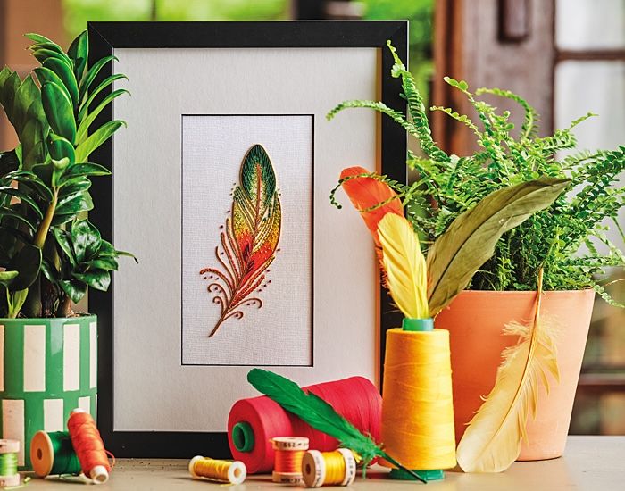 Goldwork techniques and brightly coloured threads perfectly combine to depict a rainbow lorikeet feather.