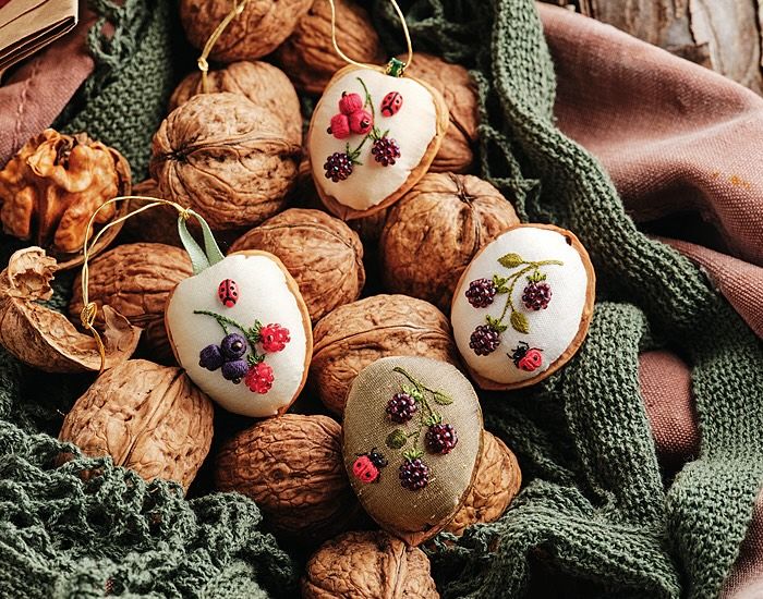 Delightful walnut shell pincushions with sprigs of beaded berries and a stumpwork or glass ladybird.