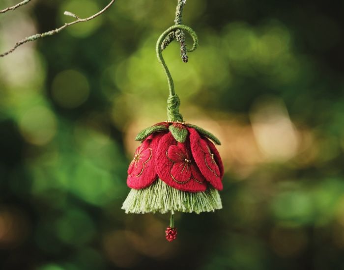 Three-dimensional Chinese lantern flower ornament in the vibrant colours of Christmas.