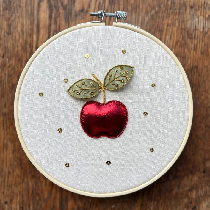 This apple embroidery project was inspired by and designed as part of my Goldwork kit, The Golden Pear.
