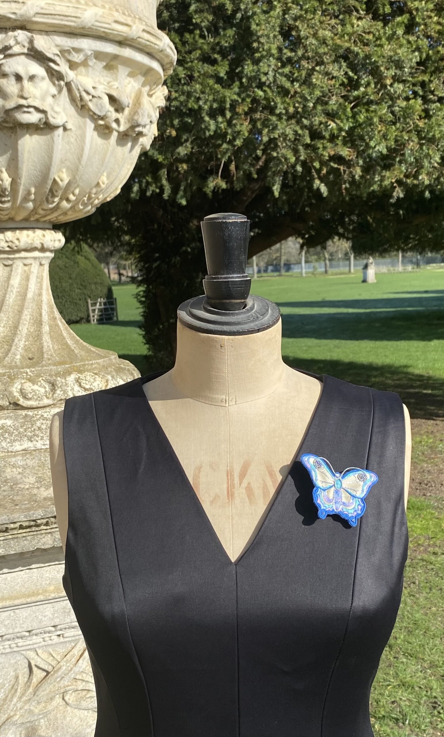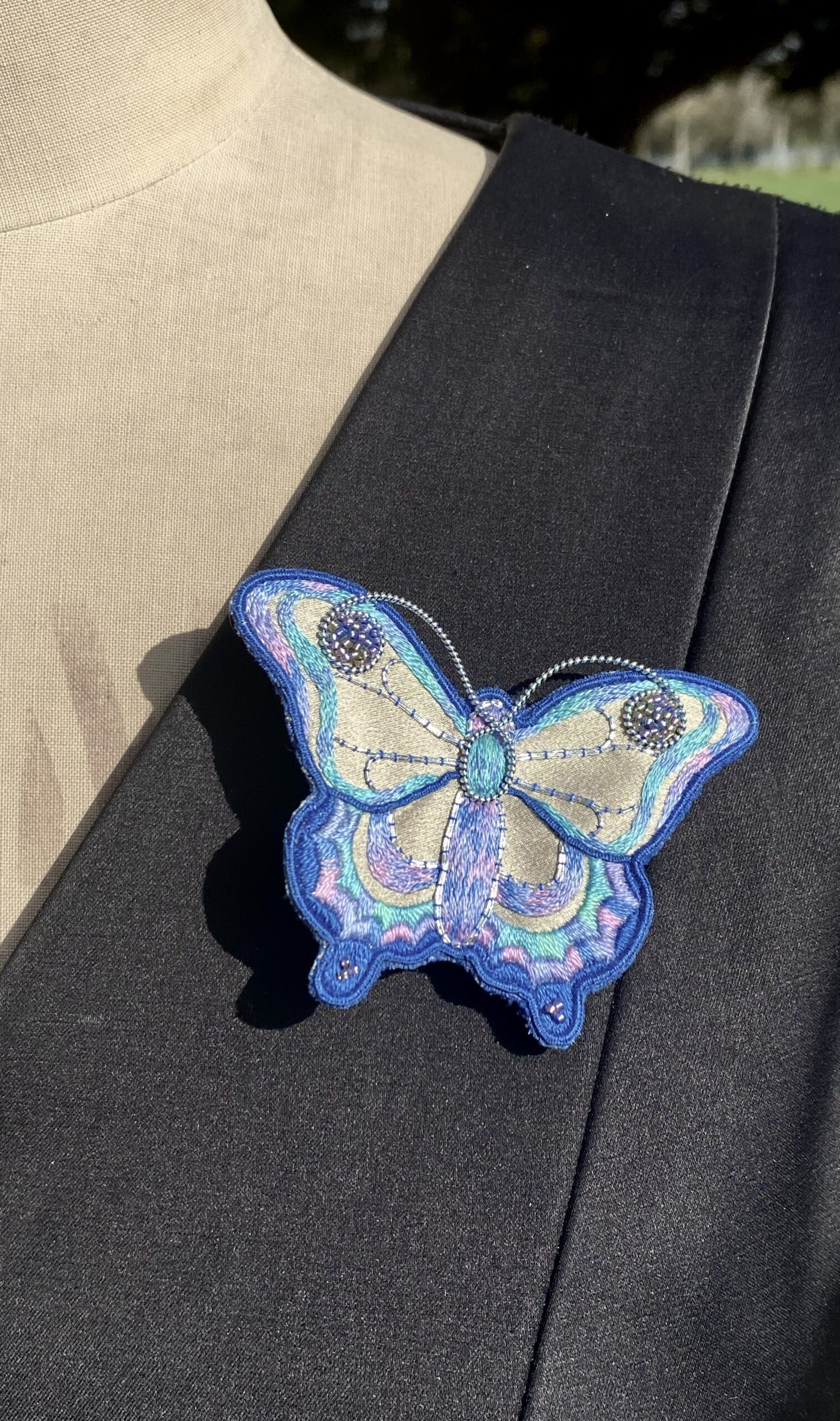 A truly wearable piece of art. The inspiration for this butterfly brooch came from an original painted fire screen design in the Royal School of Needlework archives.The flowing curves and organic lines are typical of The Art Nouveau style.
