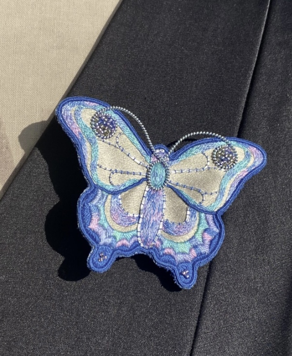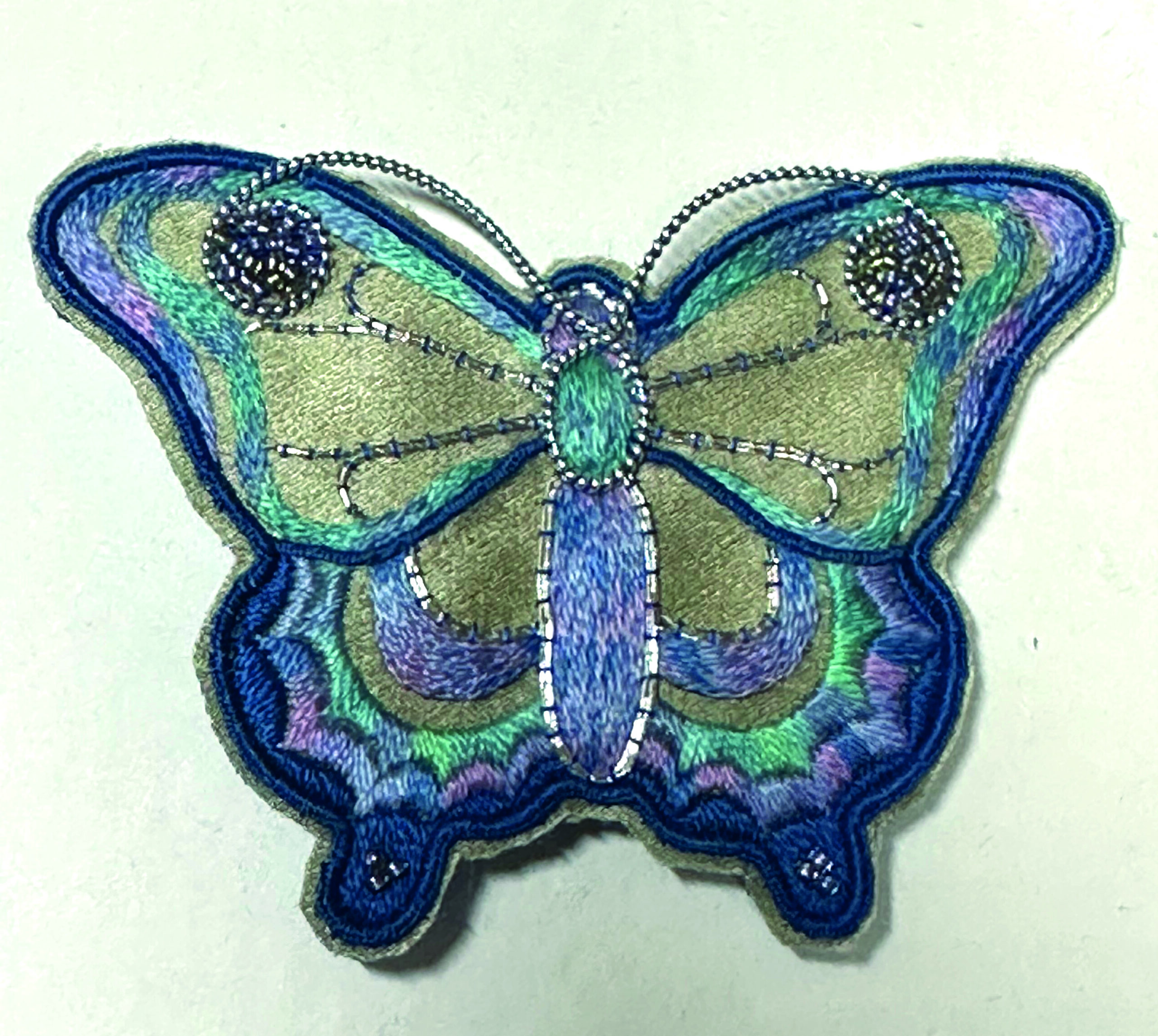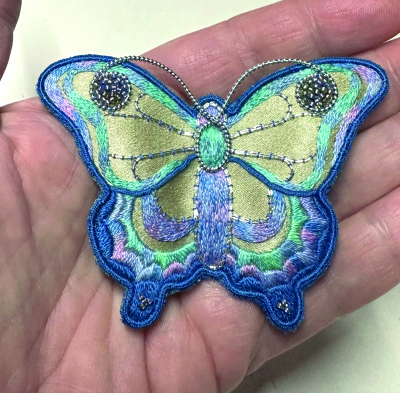 Art Nouveau influenced architecture, glass, ceramics and jewellery as well as other decorative arts.This butterfly embroidery has remained faithful to the original colours but has updated the original technique from appliqué to surface stitches, metal thread work and beading.