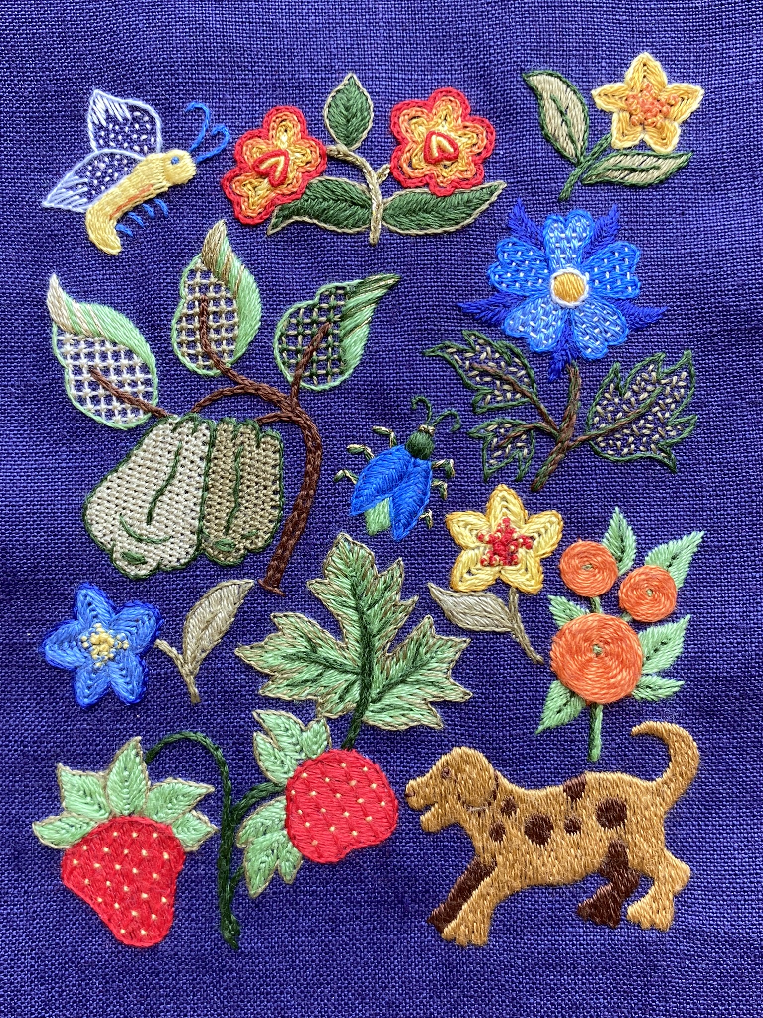 Stitches include: Blanket Stitch, Block Shading, Bullion Knots, Chain Stitch, Coral Stitch, Fly Stitch, French Knots, Laid Work, Outline Stitch, Raised Stem Band Stitch, Seeding, Trellis and many more.