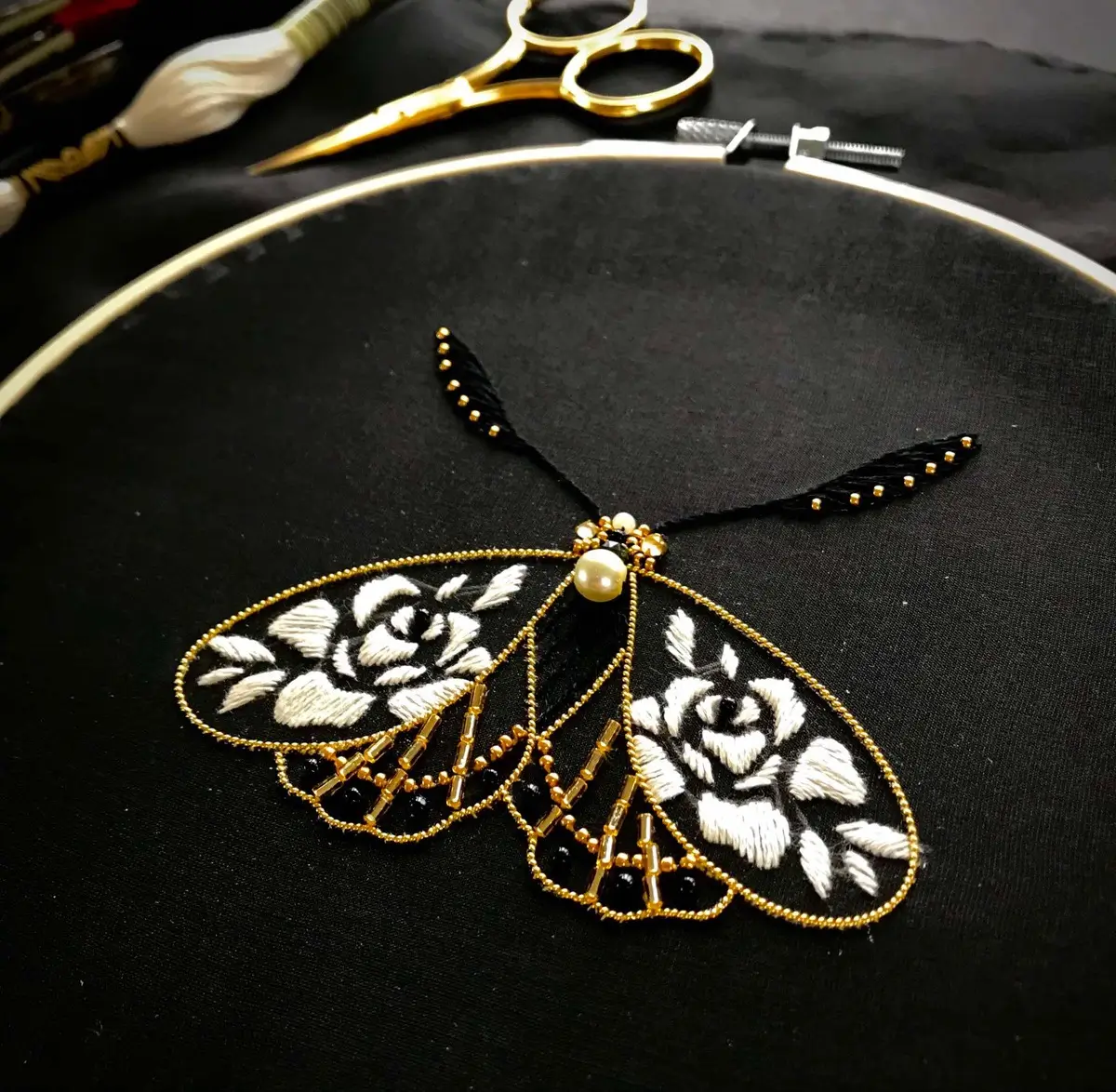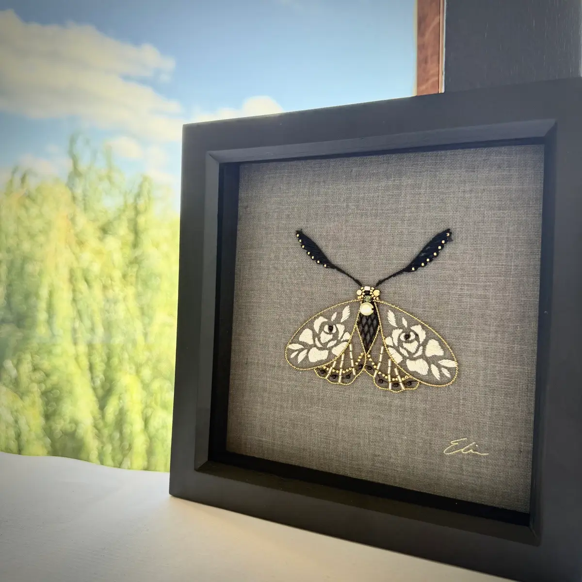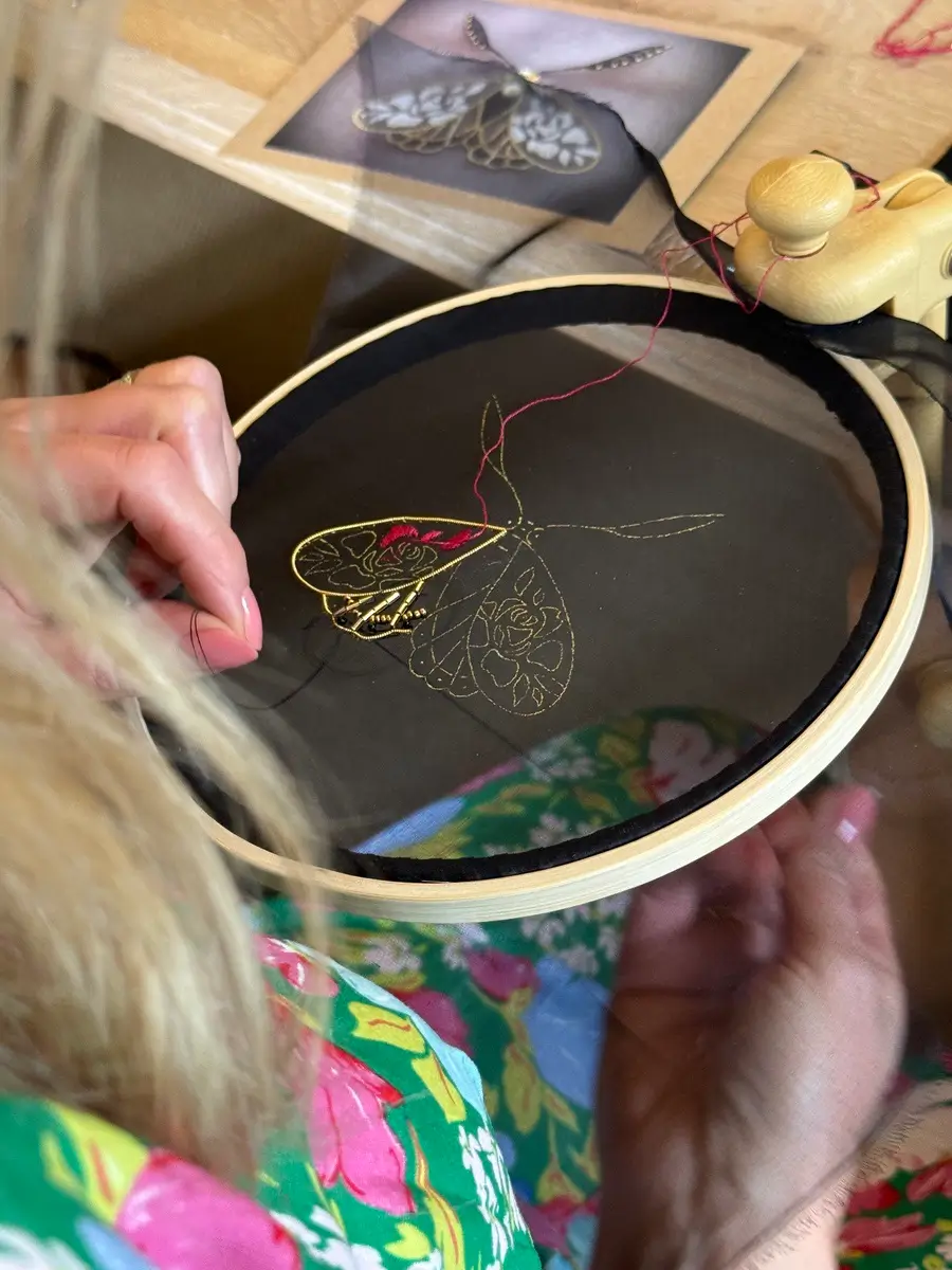 This one-day hand embroidery workshop is led by embroidery artist Eliza Gomersall and explores the creation of a detailed botanical moth design inspired by nature and fantasy, reflecting the artists signature style. The moth incorporates delicate botanical motifs within the wings, blending floral elements with the elegant structure of the insect form. Using fine materials and considered colour palettes, traditional embroidery techniques are combined in contemporary ways. The Botanist’s moth has a strong focus on craftmanship and a design that feels both timeless and fresh. Basic embroidery experience is helpful, though techniques are demonstrated and supported throughout the day. Students will have the option to choose from a variety of colour ways so their design can feel personal. All materials are provided in the kit including reference materials, such as a stitch plan and key, to support stitching during the workshop and to use at home afterwards. Demonstrations may be photographed or filmed for personal reference. As this is a one-day workshop, the design will already be transferred onto the fabric and prepared in an embroidery hoop, allowing everyone to begin stitching straight away and make the most of the time. There is no pressure to finish the piece during the workshop. The focus is on learning techniques and enjoying the process. Eliza is happy to provide supplier information for those who wish to purchase any of the tools and equipment used during the workshop.