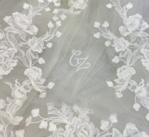 The initials were sized and positioned to be discreet and not over whelming or overpowered by the surrounding machine embroidery. It is always tricky to transfer the design onto the net but our talented team have their special ways to do this. The letters were embroidered onto the net using padded satin stitch, giving the letters some weight, so it is readable from a distance as she walked down the aisle. The embroidery was not too heavy as this would cause distortion to the veil in the surrounding area and in time cause greater wear and tear. As this will be a future heirloom it is important that the embroidery does not jeopardise the longevity of the piece.